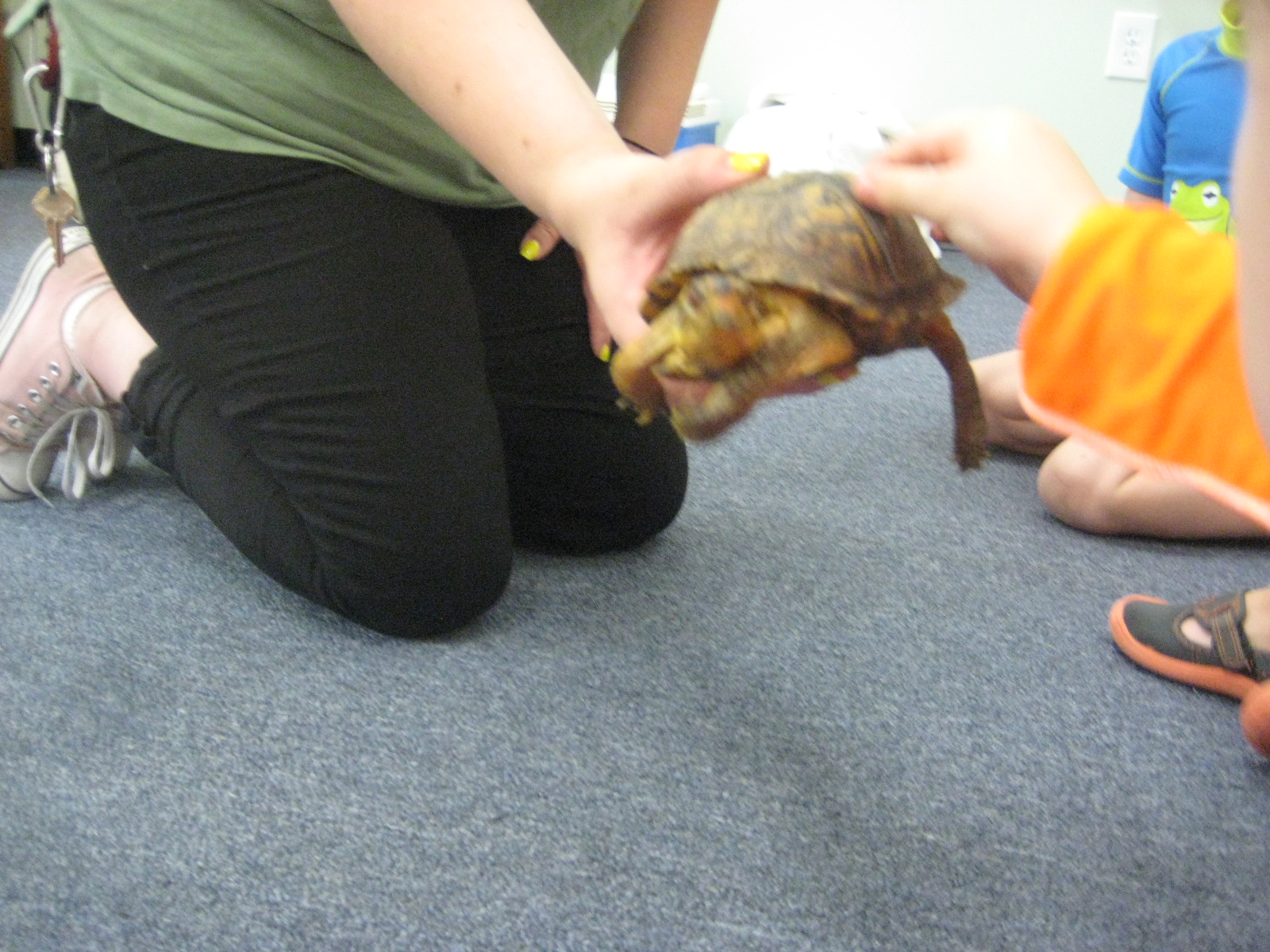 The visit from the Stone Zoo was quite an educational experience! We all learned many new facts about animals that are found locally. We got to see 2 different types of antlers, compare feathers from a bald eagle and barn owl, we got to see two types of turtles, quills from a porcupine - did you know each quill is over a foot long?, and we learned about the interesting lifestyle of a chinchilla! It was very interesting to hear the different sounds from the feathers of the bald eagle and the barn owl. The children were asked if feathers make any noise. The children quickly said no because feather are as light as air. Well sure enough, when waved through the air, the bald eagle feather made quite the flapping sound and that was just one feather! However, the barn owl feather was completely silent which helps the owl hear the mice scurrying around the barn during the dark night. Before the zoo educators left, we got to meet Clyde the chinchilla from South America, Manny the Blanding's turtle and Phoenix the box turtle from Massachusetts.