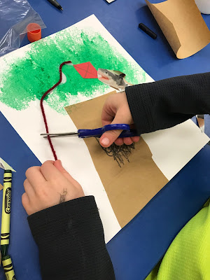 On top of all that, we introduced our book of the month, “Stuck,” by Oliver Jeffers. This story is about a young boy named Floyd who gets his kite stuck up in a tree. He tries throwing anything and everything he can find up into the tree to try and get his kite down. When he throws up the last object, the tree becomes too full and down comes his kite. The kiddos have been getting a kick out of all the ridiculous things the boy finds to toss up in the tree and we have begun making our own trees inspired by the one from the book!